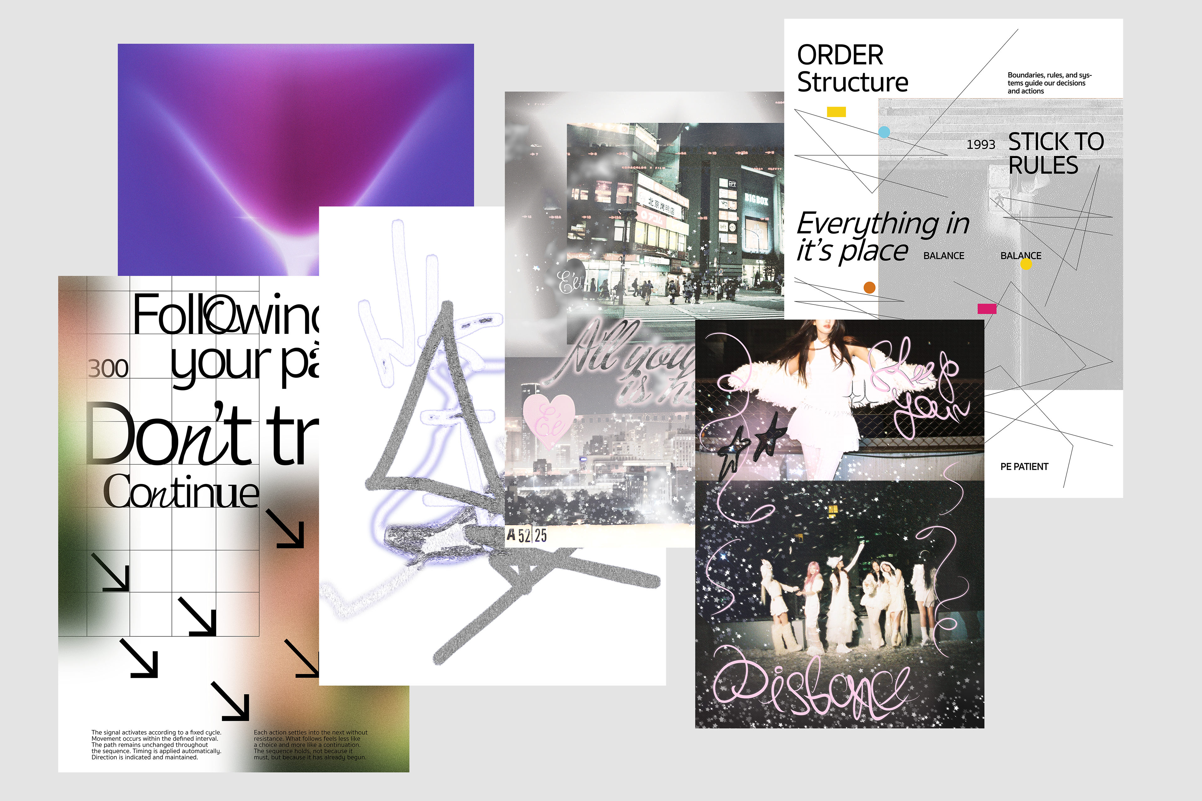 This project is a series of experimental posters exploring direction, structure, and stylistic contrast within graphic design. The focus was on freely testing different visual languages through grids, colour palettes, typography, and hand-drawn graphic elements.